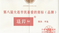 通過市工商局和國家統(tǒng)計局大連調(diào)查隊合作,以及《大連日報》、《大連晚報》、《新商報》等媒體合作,經(jīng)過一個月的調(diào)查統(tǒng)計工作,最終大連“曉芹”商標(biāo)(品牌)獲得大連市政府頒發(fā)的“市民喜愛的商標(biāo)”稱號證書、牌匾。