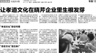 2014年1月24日,以曉芹企業(yè)孝道、感恩文化為主題,半島晨報社區(qū)報做了詳細(xì)報道“孝道文化”建設(shè)傳播王曉芹董事長對員工常掛在嘴邊的一句話說的好:“人的一生有三件事情不能等:學(xué)習(xí)不能等,健康不能等,孝敬不能等。”起初,王總基于自己個人情懷最先將孝道文化引入公司…